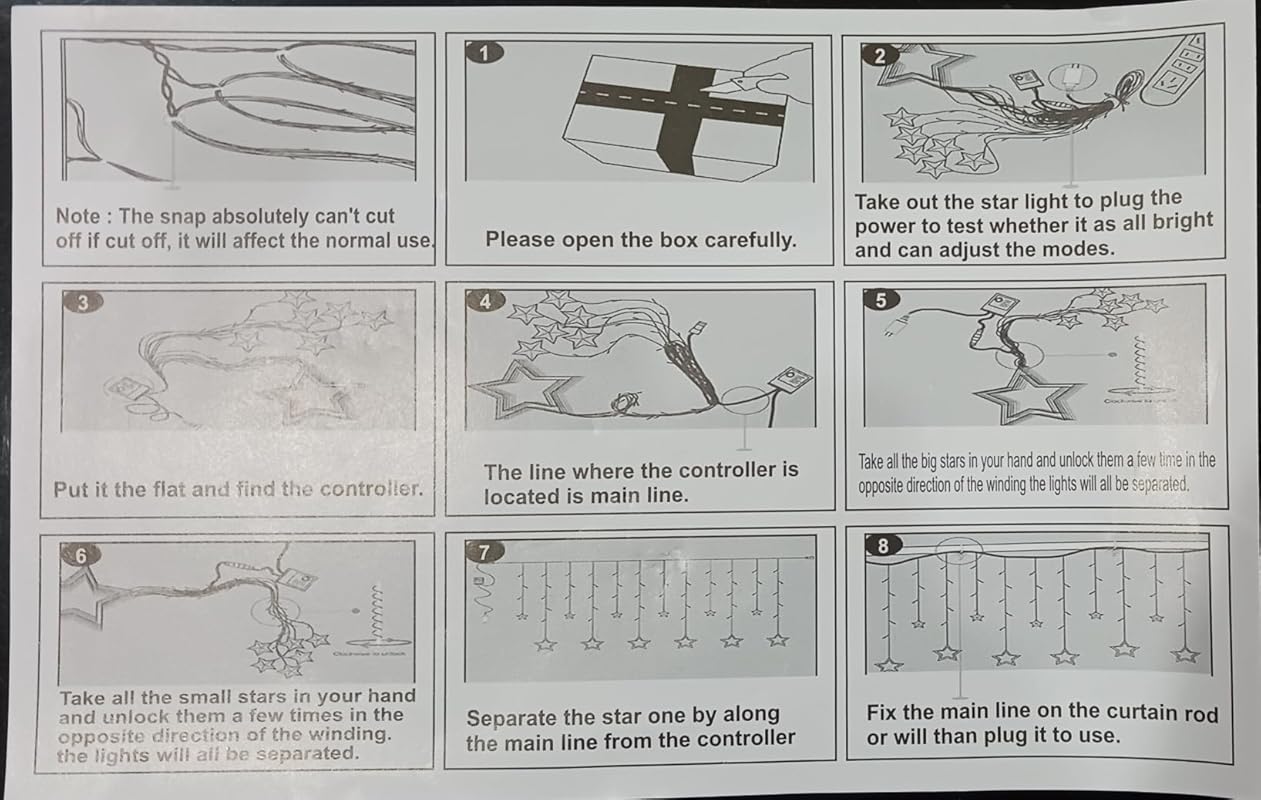 These 138-LED 2.5m Star ⭐ String Lights are available by multiple sellers, but what makes DesiDiya great 👌🏻 is the packaging 🎁.So far I have placed order 🛒 for festive lights 🕯️ from 4 different brands/sellers. Destinct than the rest, the DesiDiya box is so beautiful 😍 that it is Gift Worthy. Instead of gifting a box full of sweets (Soanpapdi 😂) to health/diabetes 🍬 conscious recipient, do consider this product as an option as well.Anyway, received it last night 🌙, and quick tested it – all looks good 👍🏻. Also, something that not all brands are providing – a big size insert with instructions to unpack the lights string.Everything looks the same as mentioned in the product description and specs 📃: 138 LEDs, great brightness 🔆, 2.5 mtr 📐 size, quality of wire ➿ used, waterproofing ☂️ of individual LEDs, 220V AC plug 🔌, the 8-mode controller, and a female plug for extension.Some (hopefully) useful tips to share with you:🔅 On my side, it took 2 person 🧒🏻👨🏻 10 ⏰ minutes to untangle/unwind string of LEDs from 1 package. So buy wisely, as patience is required to put it right. I would hesitate to open more than 2-3 boxes per day 😂🔅 Don’t rush to open the box 🎁 , but do go through the step-by-step 🪜 pictorial instructions provided in the box (or my attached image 🖼️)🔅 Even though I did not find any cuts/kinks in the wires, use standard precautions when dealing with 220V AC ⚡ – please don’t handle the wires with bare hands 🖐🏻 when plugged-in and switched-ON🔅 The 2-pin shoe 🔌 is of bare minimum quantity – you would have to be careful that the wire is not badly/sharply bent where the plug ends🔅 Please don’t ignore the fact that the controller is not waterproof, but be careful and responsible, and do waterproof it with some polythene piece and adhesive tapeIt is a good investment for years to come as the product looks durable. Finally, comparing ⚖️ price 🏷️ with other worthy competitors with same specs, I am giving it 5-star rating ⭐🌟⭐🌟⭐
